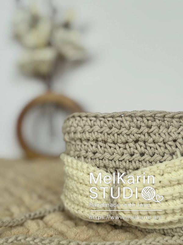 Նրբագեղ ձեռագործ պայուսակ՝ ժապավենով․ հմայիչ և ոճային աքսեսուար փոքրիկ աղջիկների համար։ Պատրաստված է բամբակյա թելից, զարդարված է ծավալուն կրեմագույն ժապավենով։ Պայուսակը փոքրիկ է, սակայն բավական տեղ ունի անհրաժեշտ մանրուքների համար՝ թաշկինակ, մազակալ կամ սիրելի