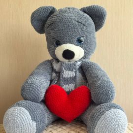 Մեծ փափուկ ձեռագործ արջուկը կատարյալ նվեր է ձեր սիրելիների համար։ Կապտամոխրագույն արջուկը ձեռքում պահում է վառ կարմիր սրտիկ, որը խորհրդանշում է սեր և ջերմություն։ Միջավայրին նրբություն հաղորդող դիզայնը, փափուկ գործվածքը և արտահայտիչ աչքերը նրան դարձնում են