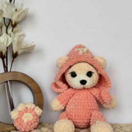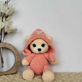 Հմայիչ, ձեռագործ արջուկ՝ նուրբ դեղձագույն գլխարկով ու հագուստով։ Պատրաստված է փափուկ, պլյուշե մանվածքից՝ իդեալական նվեր է փոքրիկների համար կամ որպես գեղեցիկ դեկոր մանկական սենյակում։