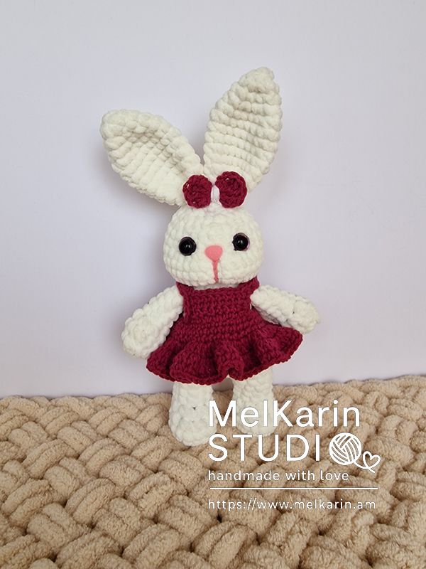 Փափուկ պլյուշ մանվածքից այս հմայիչ ձեռագործ նապաստակը հիանալի նվեր կլինի երեխայի համար կամ նորաոճ դեկորատիվ տարր: Ձյունաճերմակ փափկամազը հագած է գործված բորդո զգեստ, որն ավելացնում է անհատականություն և հմայք։ Խոշոր արտահայտիչ աչքերը և գեղեցիկ մռութիկը այս նապաստակին