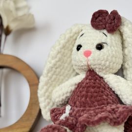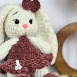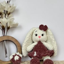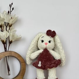 Նուրբ ձեռագործ նապաստակ՝ հագած մուգ բորդո զգեստ և ականջին նույն գույնի ծաղկաձև զարդ։ Պատրաստված է հիպոալերգեն պլյուշե մանվածքից՝ շատ փափուկ և հաճելի շփման համար։