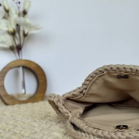 Այս կլոր ձեռագործ պայուսակը համադրում է բնական ոճն ու նրբագեղ պարզությունը։ Հյուսված է 100% բամբակյա թելից՝ բեժ երանգով, որը կատարյալ է ինչպես առօրյա, այնպես էլ ամառային տեսքի համար։ Թելից պատրաստված բազկաթելը և դեկորատիվ թելային փունջը՝ տալիս են յուրահատուկ հմայք։