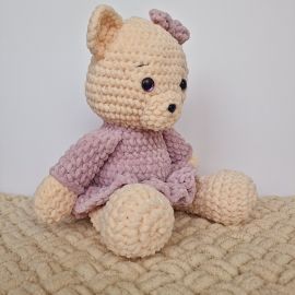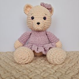 Цвет и материал: Мишка выполнена в нежном абрикосовом цвете, который придает ей теплый и уютный вид. Платье мишки сиреневого цвета из легкого и приятного на ощупь акрила, создающего легкость и воздушность.