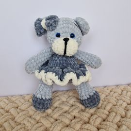Цвет и материал: Мишка выполнена в нежном синем цвете, который придает ей теплый и уютный вид. Платье мишки серо-голубого цвета из легкого и приятного на ощупь акрила, создающего легкость и воздушность.