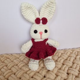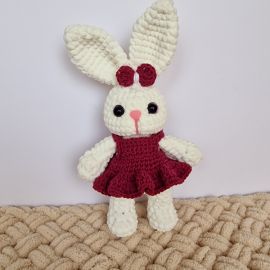 ДобавитьОчаровательный зайчик, связанный вручную из мягкой плюшевой пряжи, станет прекрасным подарком для ребенка или стильным элементом декора. Белоснежный пушистик одет в вязаное бордовое платье, добавляющей индивидуальность и шарм. Большие выразительные глаза и трогательная мордочка делают этого зайку по-настоящему живым и любимым с первого взгляда.