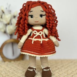 Очаровательная вязаная кукла ручной работы выполнена в технике амигуруми. Кукла одета в яркое оранжевое платье с белыми вставками, берет и туфельки. Рыжие кудри и выразительные глазки придают ей особую индивидуальность. Отличный подарок для детей и коллекционеров, а