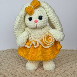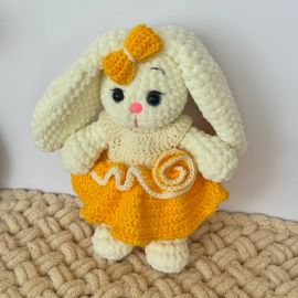 ДобавитьОчаровательная вязаная зайка ручной работы — лучший подарок для ребёнка или душевное украшение интерьера! Зайка выполнена из мягкой, плюшевой пряжи молочного цвета. Яркое жёлтое или бордовое платье с рюшами и бантик на ушках придают ей радостное и солнечное настроение. Игрушка безопасна, приятна на ощупь и прекрасно подходит как для игр, так и для фотосессий.