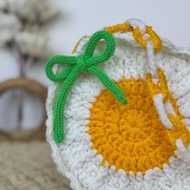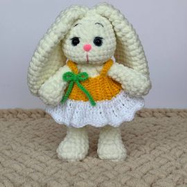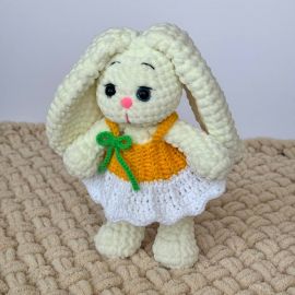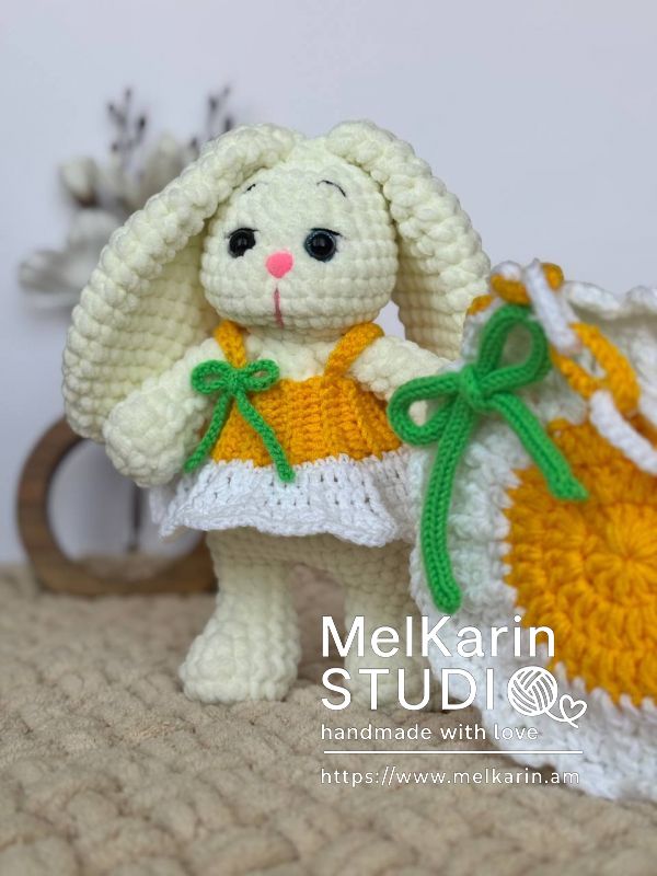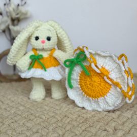 Սիրուն ձեռագործ հավաքածու՝ նախատեսված փոքրիկների համար։ Փափուկ ու գրկելու համար հարմար նապաստակը հագած է գարնանային դեղին զգեստ, իսկ նրա կողքին է ձեռագործ «մարգարիտ» պայուսակը՝ կանաչ ժապավենով։ Հիանալի նվեր երեխայի կամ ֆոտոշարքի համար։