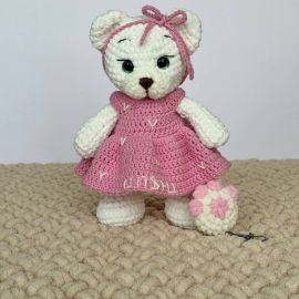 Նուրբ ու սիրելի ձեռագործ արջուկ՝ վարդագույն հյուսած զգեստով և գլխակապով։ Պատրաստված է փափուկ, հիպոալերգեն թելերով, լիովին անվտանգ է երեխաների համար։ Հիանալի տարբերակ է նվերի, լուսանկարների կամ դեկորի համար։