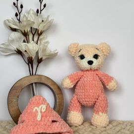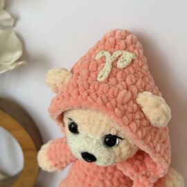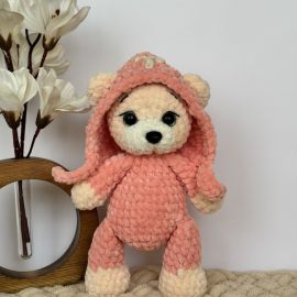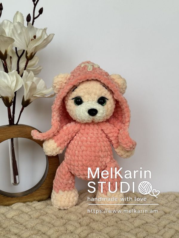 Հմայիչ, ձեռագործ արջուկ՝ նուրբ դեղձագույն գլխարկով ու հագուստով։ Պատրաստված է փափուկ, պլյուշե մանվածքից՝ իդեալական նվեր է փոքրիկների համար կամ որպես գեղեցիկ դեկոր մանկական սենյակում։
