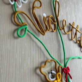 Այս գեղեցիկ պատային զարդը՝ Violetta անունով, ստեղծված է «տրիկոտին» տեխնիկայով՝ հատուկ փափուկ բամբակյա թելով պատված մետաղալարով։ Յուրաքանչյուր տարր՝ տառից մինչև ծաղիկ և արջուկ, հյուսված է ձեռքով, սիրով և ուշադրությամբ։ Կազմությունը համալրվում է երեք երազանքային