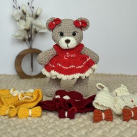 Милый вязаный медвежонок с гардеробом — мечта каждого ребёнка! Этот плюшевый мишка одет в яркое красное платье и украшен бантиками. В комплекте также идут дополнительные сменные наряды — платьица разных цветов с бантиками, которые можно менять по настроению.