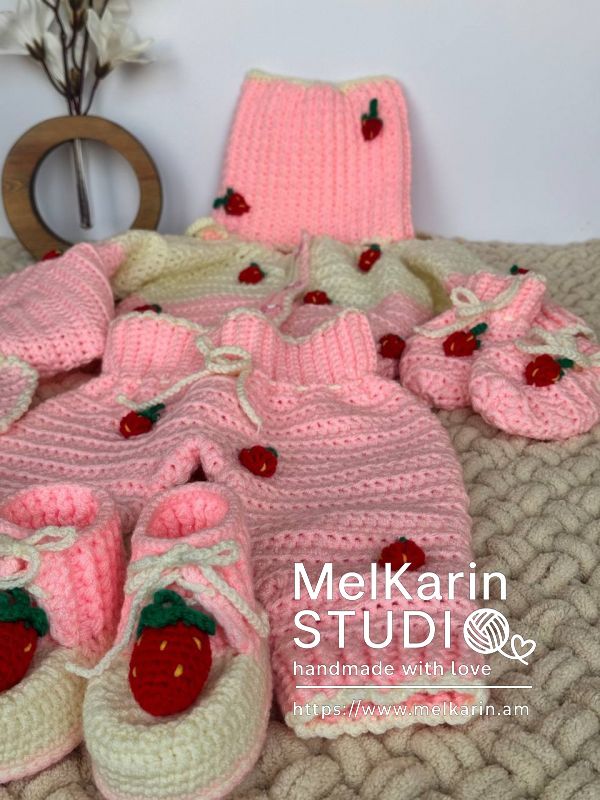 Очаровательный вязаный детский комплект «Клубничка», выполненный полностью вручную. Нежные пастельные оттенки розового и кремового гармонично сочетаются с маленькими вязанными клубничками, создавая тёплый и уютный образ.