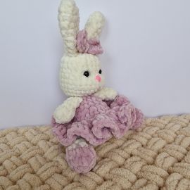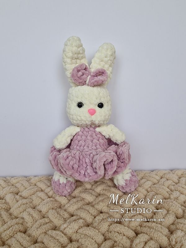 Этот очаровательный белый зайчик в сиреневом платье — настоящее воплощение уюта и волшебства. Вязанный с любовью и вниманием к каждой детали, зайчонок обладает мягкой текстурой и нежными, словно облако, ушками. Его платье, выполненное в оттенке нежного сиреневого,