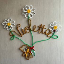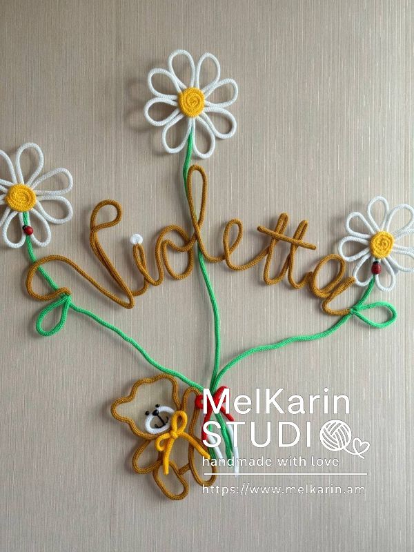 Очаровательное настенное украшение с именем Violetta — это уникальный элемент декора, выполненный в технике трикотин (tricotin). Каждая буква и деталь выложены вручную из мягкой хлопковой пряжи, благодаря чему изделие выглядит особенно нежно и аккуратно.